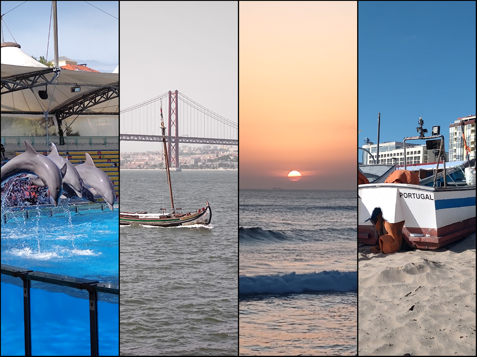 Des dauphins, le Tage, l'océan, des bateaux.